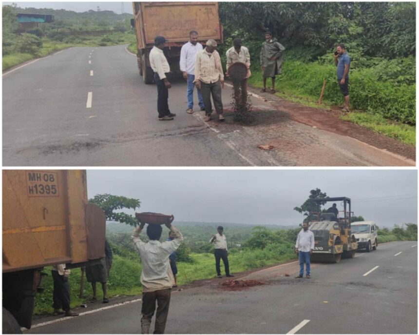 जयगड–निवळी रस्त्यावरील खड्डे बुजवण्यास सुरुवात; भाजपा तालुकाध्यक्ष प्रतिक देसाई यांच्या तक्रारीची दखल